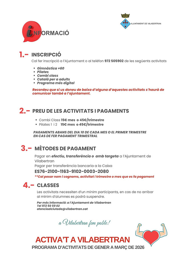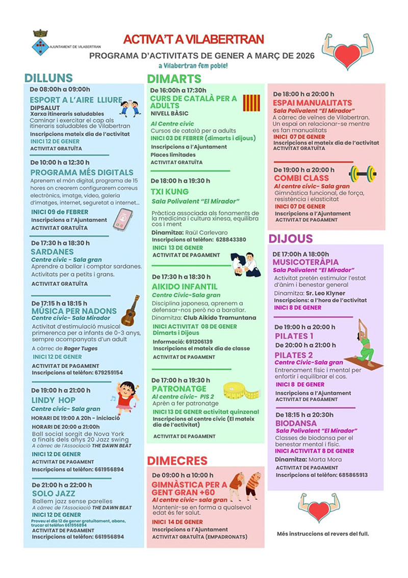 Actualitat, Agenda, General ACTIVA’T A VILABERTRAN – 2026 01/01/2026 - 31/03/2026 | VILABERTRAN 💪💓 PROGRAMA D’ACTIVITATS DE GENER A MARÇ DE 2026 < Entrada Anterior