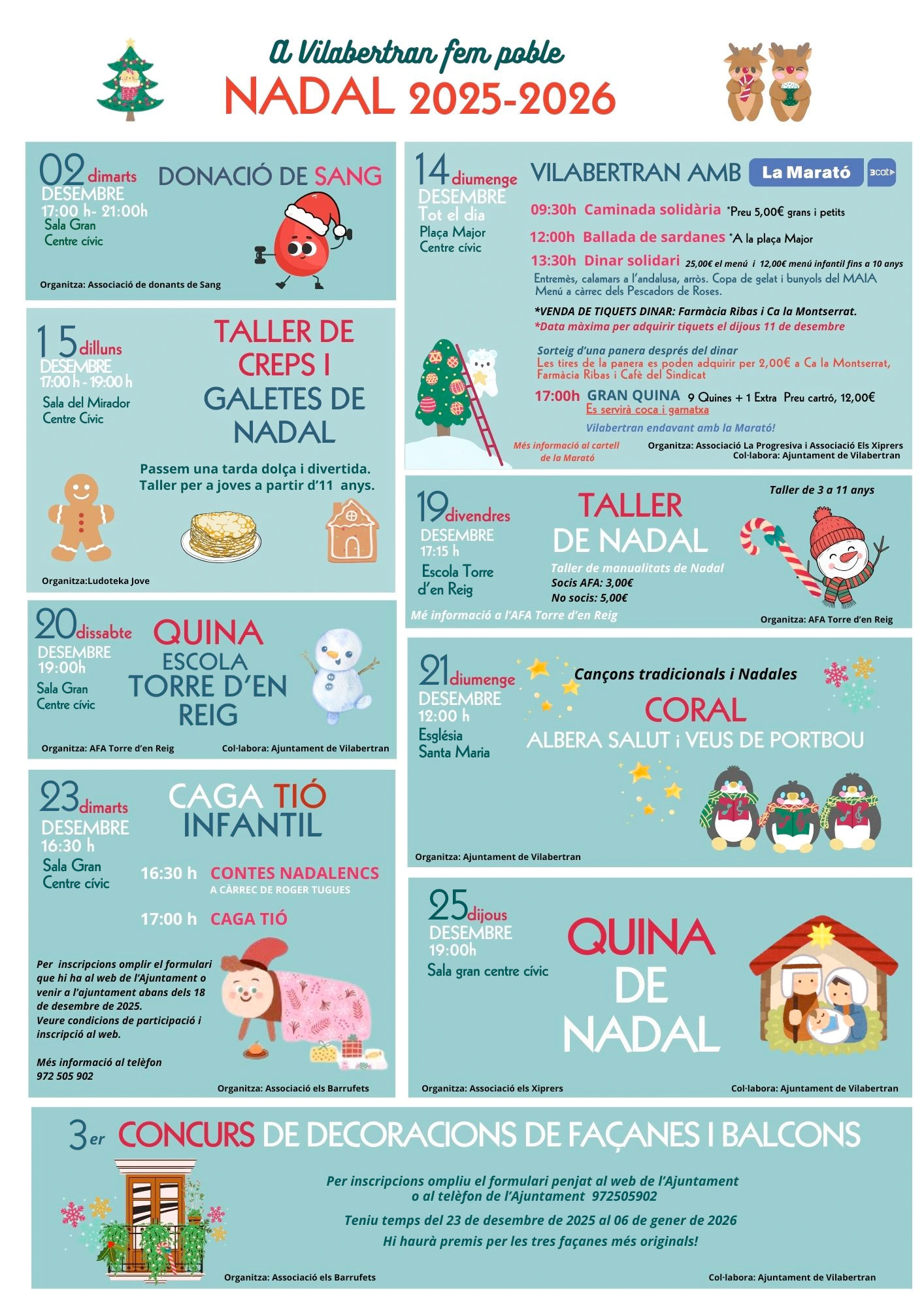 Vilabertran està a punt per a Nadal. Com cada any, comptareu amb diferents activitats i propostes perquè pugueu gaudir del poble i de la nostra gent: tallers de Nadal, infantils, cinema, donacions de sang, quines, Cap d’Any, cavalcada de reis…