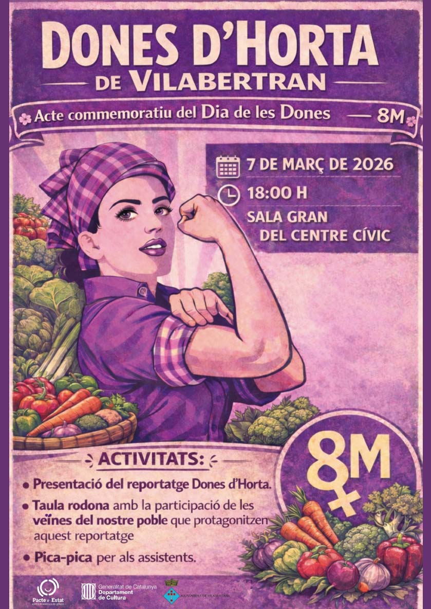 Actualitat, Agenda, General Dones d’Horta de Vilabertran! 01/04/2026 - 31/05/2026 | Vilabertran ♀️👏💜 El pròxim 7 de març, a les 18 h, a la Sala Gran del Centre Cívic de Vilabertran es portaran a terme un seguit d’activitats per commemorar el Dia de les Dones. No us ho podeu perdre! Entre tots fem poble. Entre tots fem feminisme! < Entrada Anterior